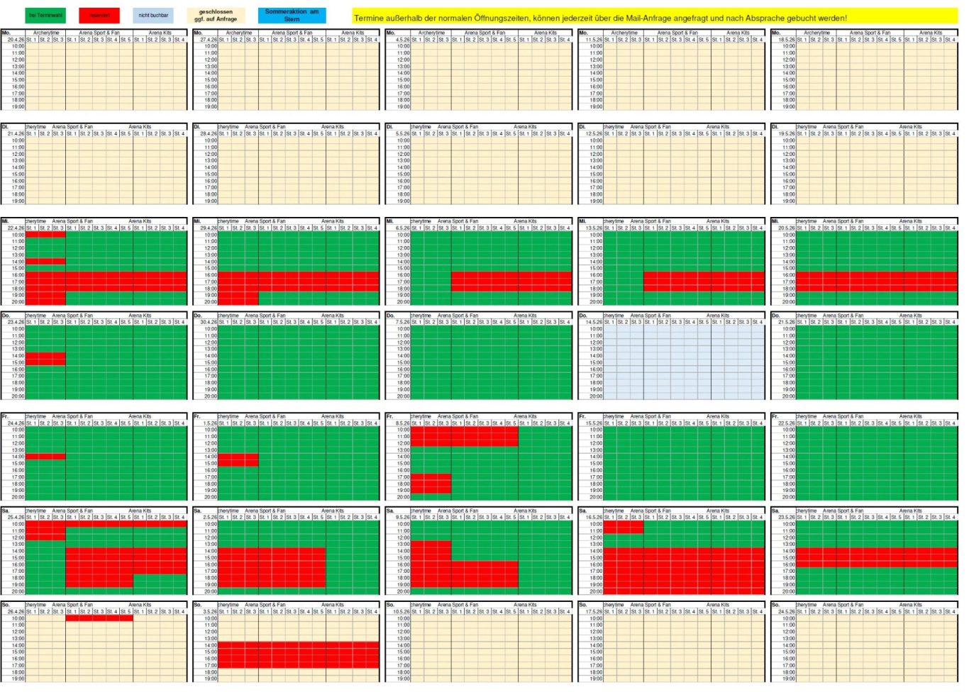 Belegungsplan online auf der Webseite einsehbar, aber vorerst nur per Mail oder telefonisch buchbar!